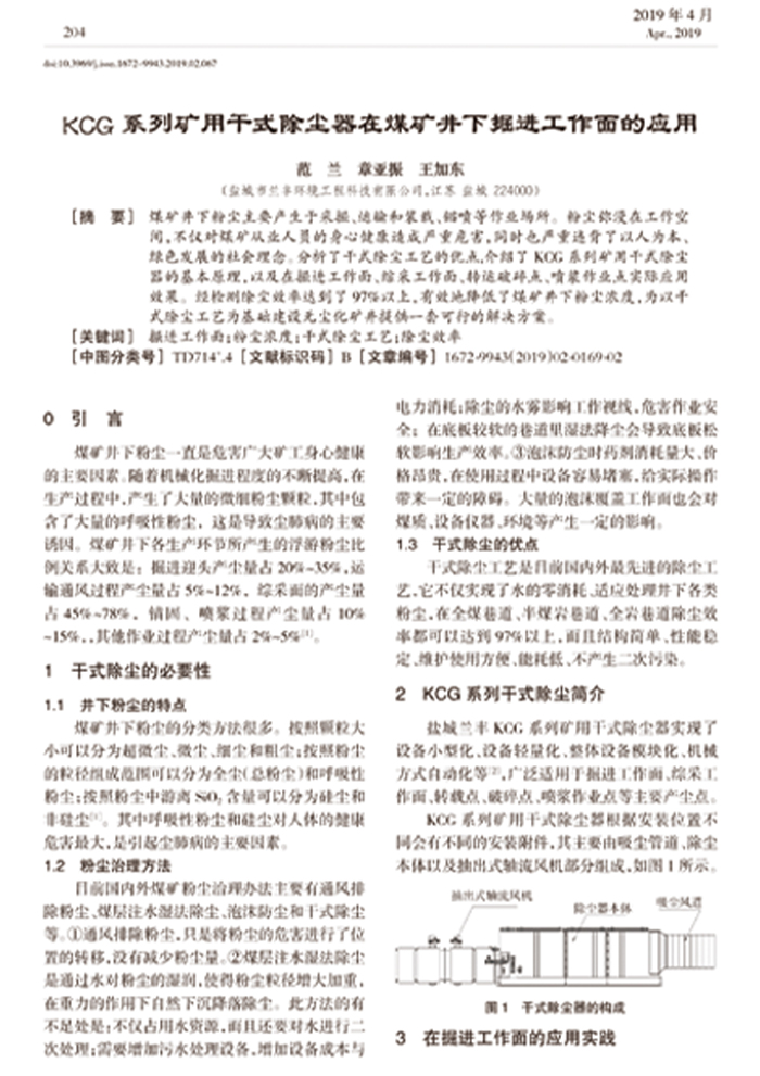 KCG礦用幹式除塵器(qì)在煤礦井下(xià)掘進工作(zuò)面的應用